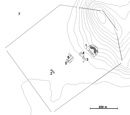 План на римската колония Скупи: 1. Театър; 2. Гражданска базилика; 3. Villa urbana; 4. Раннохристианска базилика; 5. Хореум; 6. Баня; 7. Западен некропол.