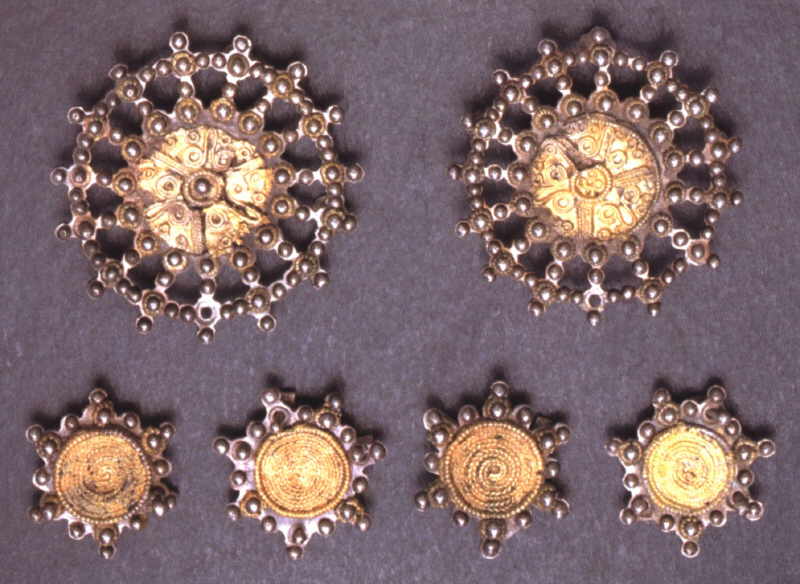Skvostné stříbrné a pozlacené přezky a kování opasku zdobené filigránem a granulací.