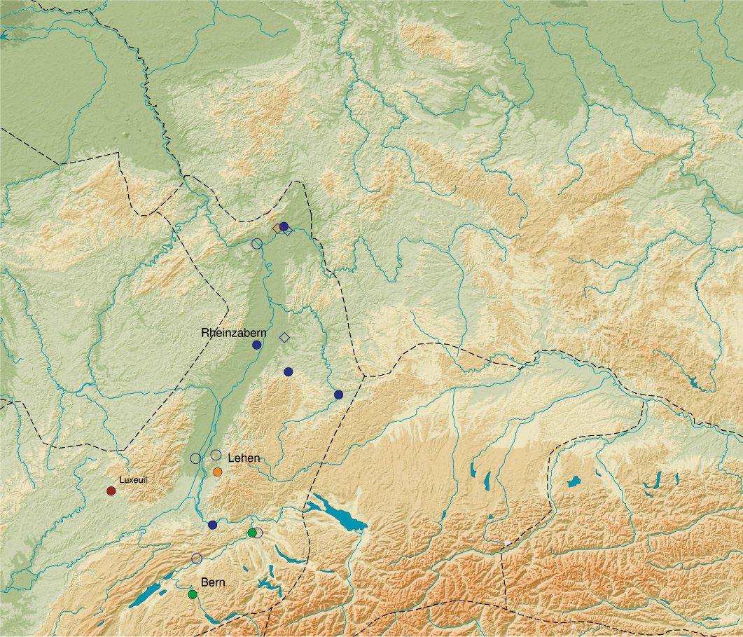 Blau: Rheinzabern; Braun: Luxeuil; Grün: Bern; Orange: Lehen.