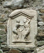 Relief aus Maria Saal. Sie hält ein geöffnetes Kästchen in der Hand und greift gerade hinein, er hält einen Krug in der Rechten und hat ein Tuch über die linke Schulter gehängt. Es kann sich hier um eine häusliche Szene handeln, genausogut aber um ein Opfer (Weihrauchkästchen?) oder die Andeutung von Ritualen rund um das Begräbnis.