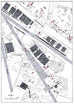 Auch in dem an einem Hang angelegten kleinen Töpfereiort von Schwabmünchen waren die Wohngebäude an zwei Straßen aufgereiht, wobei die vier Häuser an der tiefer gelegenen Trasse II ebenso wie die Werkhalle an Trasse I die ältesten sind und in die claudische Gründungsphase gehören. Die Häuser an der Trasse III kamen erst später ab Ende des 1. Jahrhunderts hinzu. Offenbar wurden die älteren Häuser noch vor Aufgabe der Siedlung in der Mitte des 3. Jahrhunderts aufgegeben, denn sie waren teilweise von großen Schuttflächen mit Hausmüll überlagert.